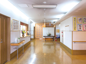 毎日、利用者様をお出迎えする。開放感あるエントランス。館内は段差のないバリアフリー仕様です。